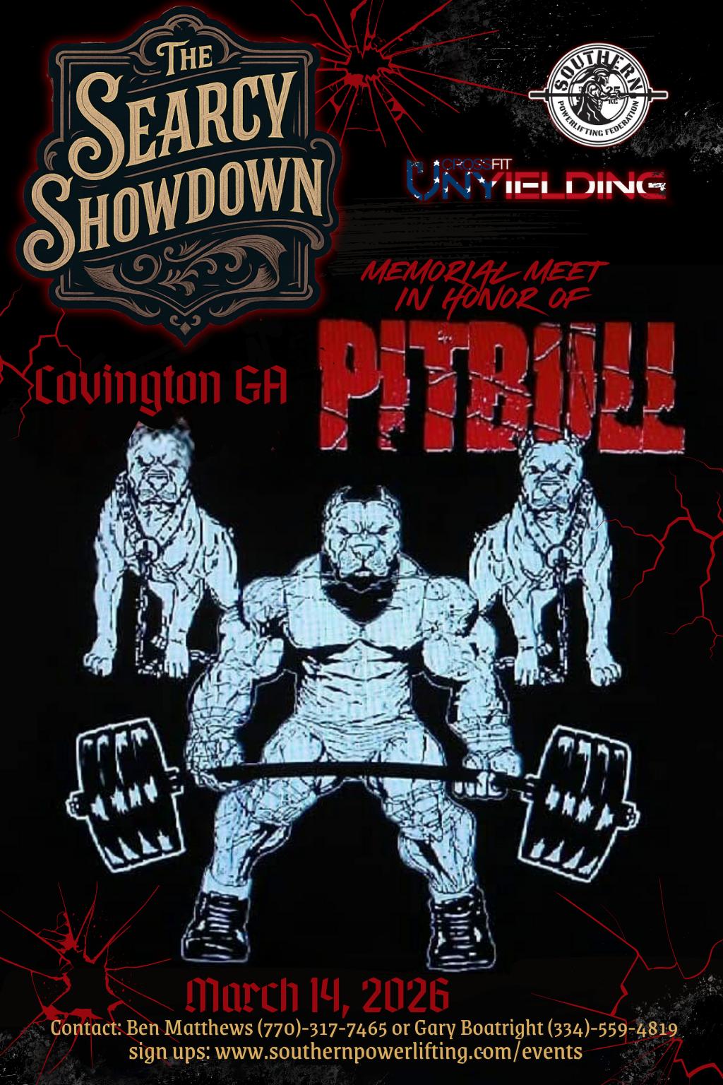 James “PitBull” Searcy was more than just a lifter — he was a brother, a mentor, and a legend in the SPF community. Known for his grit on the platform and his loyalty off of it, PitBull pulled heavy and lived even heavier, leaving behind a legacy of strength, heart, and determination. This meet is not only about big numbers — it’s about honoring the way PitBull lived: fearless, relentless, and unyielding.